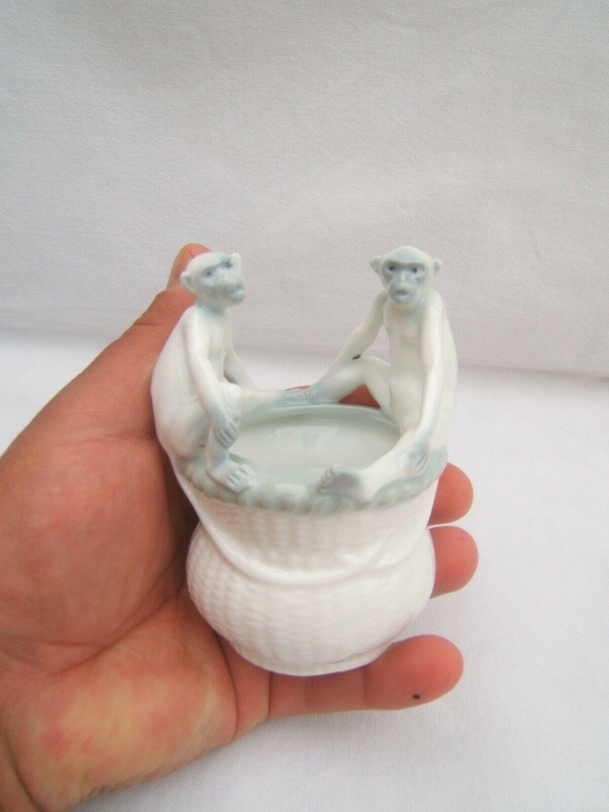 Ancien biscuit porcelaine 2 petits singe sur un panier marque déposé N 11536 .bel état photos Hauteur 10 cm
